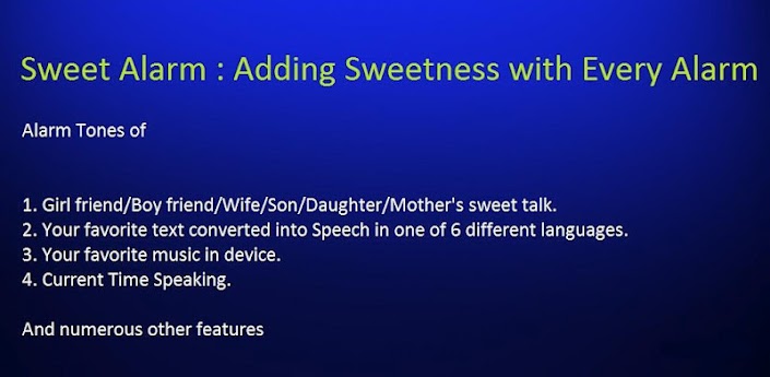 Sweet Alarm can play your dear ones voice , a sweet text spoken in one of the six different languages , your favorite song in device (using apps like ringdroid tunes ) a time speaking clock as alarm tone.